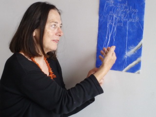 entre peinture et fils, entre " images " et mots ; des bribes de textes, des poèmes