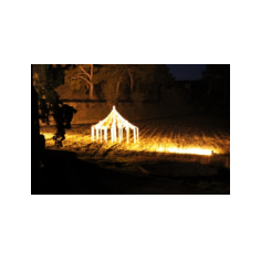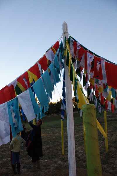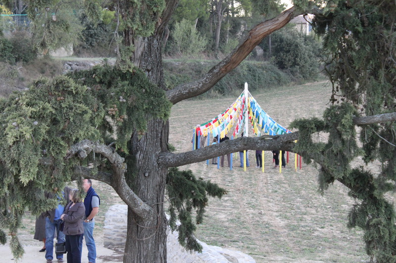 Florence Bouvry crée une yourte "temple" dédiée à l'écoute des mémoires languedociennes" sur le principe du kiosque à musique, autrefois lieu de rencontre, d'échanges et de vie. Faisant référence aux traditions tibétaines, les drapeaux aux couleurs des quatre éléments (eau, air, terre, feu) sont imprimés de mots et d'images qui remémorent les mémoires languedociennes. Le souffle de l'air leur insuffle la vie. Les mémoires ainsi ré-